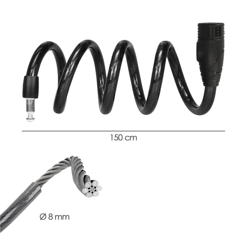 - El candado de bicicleta está compuesto por un cable de acero de 8 mm de grosor, diseñado para ser extremadamente resistente tanto a la cizalladura como a la corrosión.