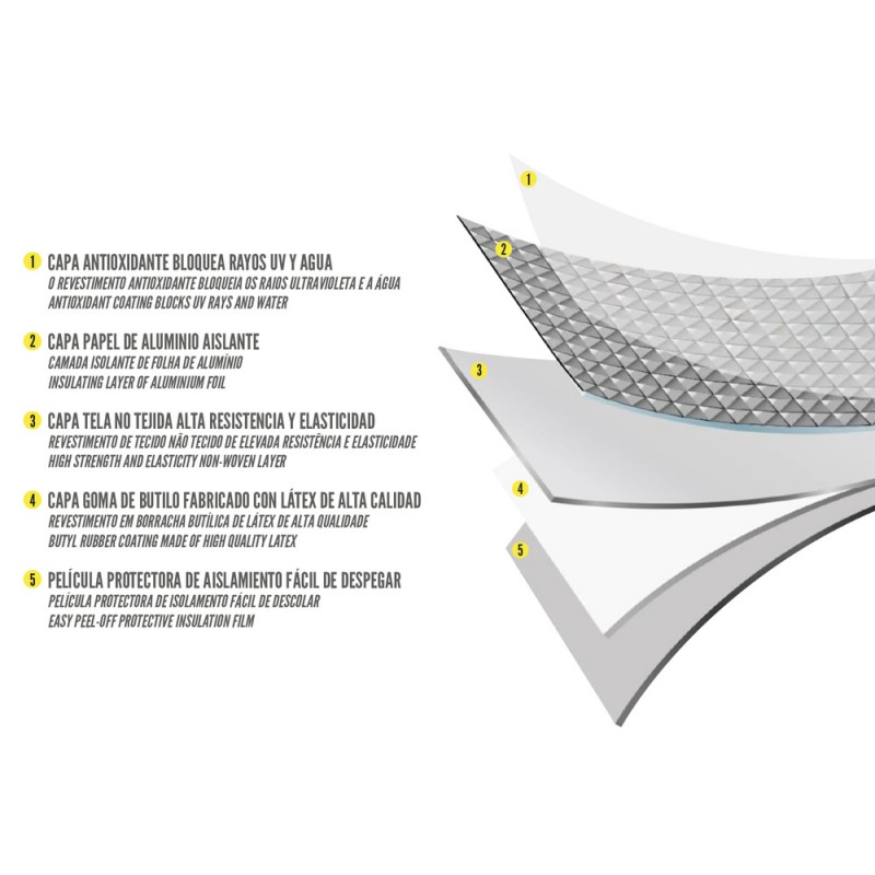 - La cinta de butilo-aluminio cuenta con varias capas que la hacen única en su categoría.
