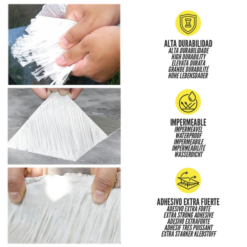 - Artículo también conocido como cinta butilo, cinta aluminio, cinta superimpermeable, cinta caucho, impermeable cinta butilo, cinta adhesiva aluminio, cinta adhesiva impermeable, cinta sellado butilo, cinta reparación, aluminio sellador, cinta butilica, etc.