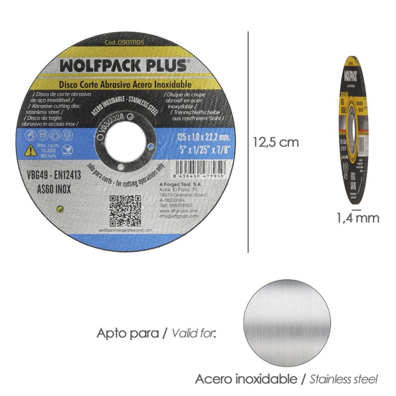 Disco Corte Abrasivo Acero Inoxidable Ø 125 x 22,2 Mm. Espesor 1,0 Mm.