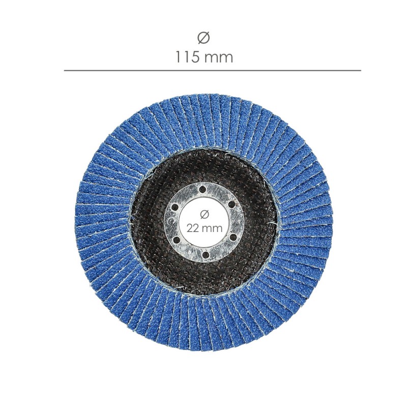 - Aletas del disco con circonio y un angulo de 10º. El circonio le aporta una duración mayor. Disco de lija para amoladora de 115 mm.