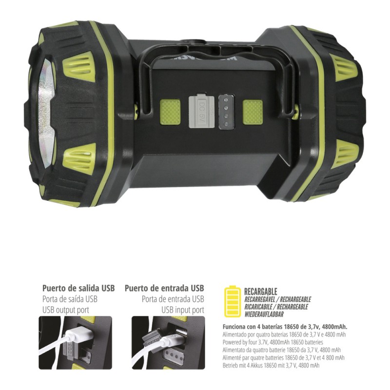 - Esta linterna también funciona como banco de carga, por lo que podrás cargar tus dispositivos electrónicos en caso de emergencia. Su asa rotativa de 180º te brinda la flexibilidad necesaria para ajustar la dirección de la luz según lo requiera la situación.