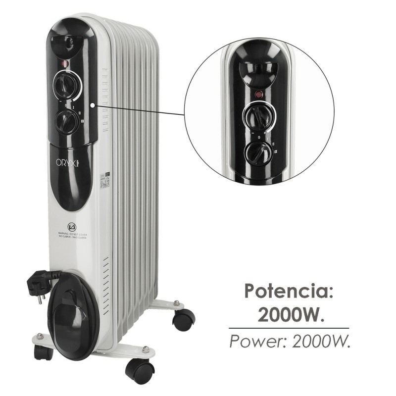 - Este radiador cuenta con un práctico asa de transporte, termostato de ambiente para prevenir sobrecalentamientos, 4 ruedas que facilitan su desplazamiento y un peso de 9,4 kgs.