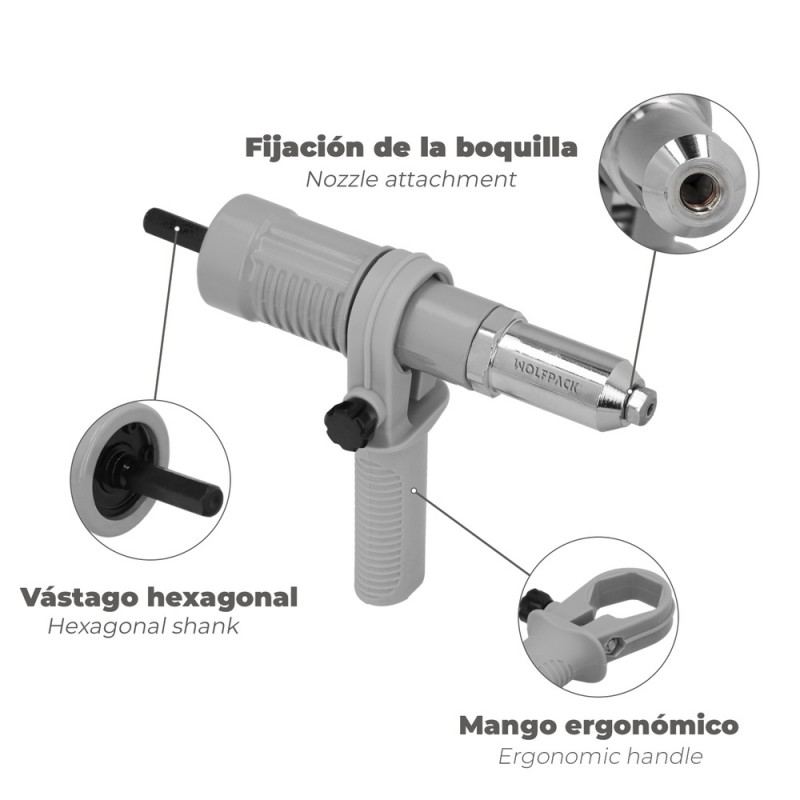 - Artículo también conocido como remachadora eléctrica, remachadora para taladro, adaptador pistola remachadora, remachadora bateria, adaptador pistola remachadora, etc.
